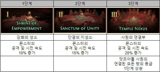 몬스터의 생명력, 피해량, 무리 증가 등의 효과를 가진 사원의 방들입니다.