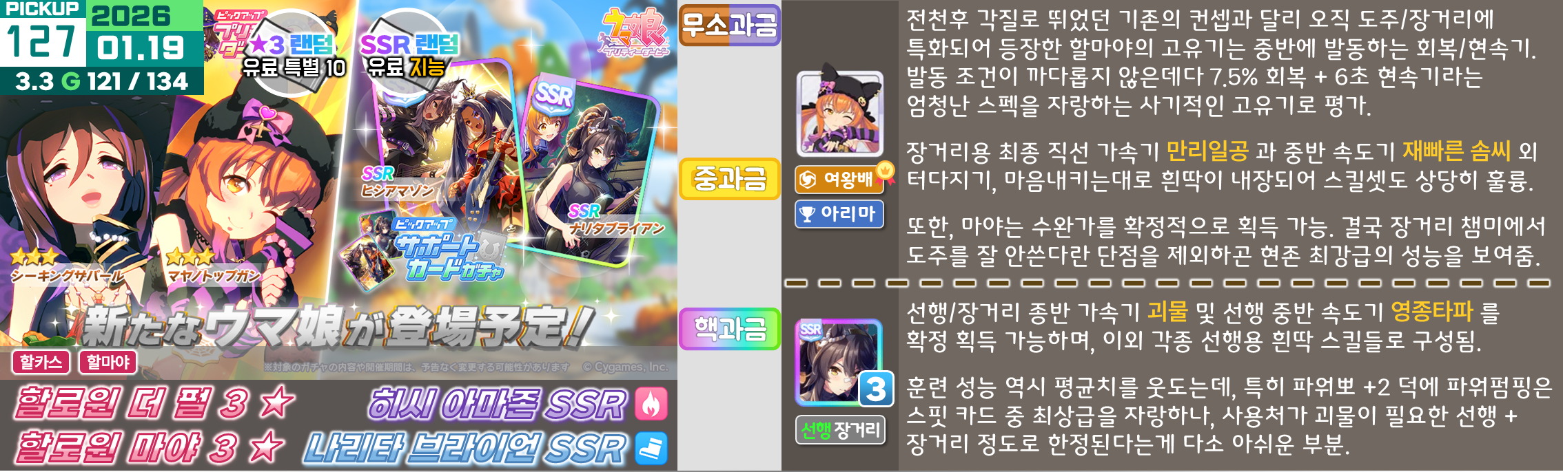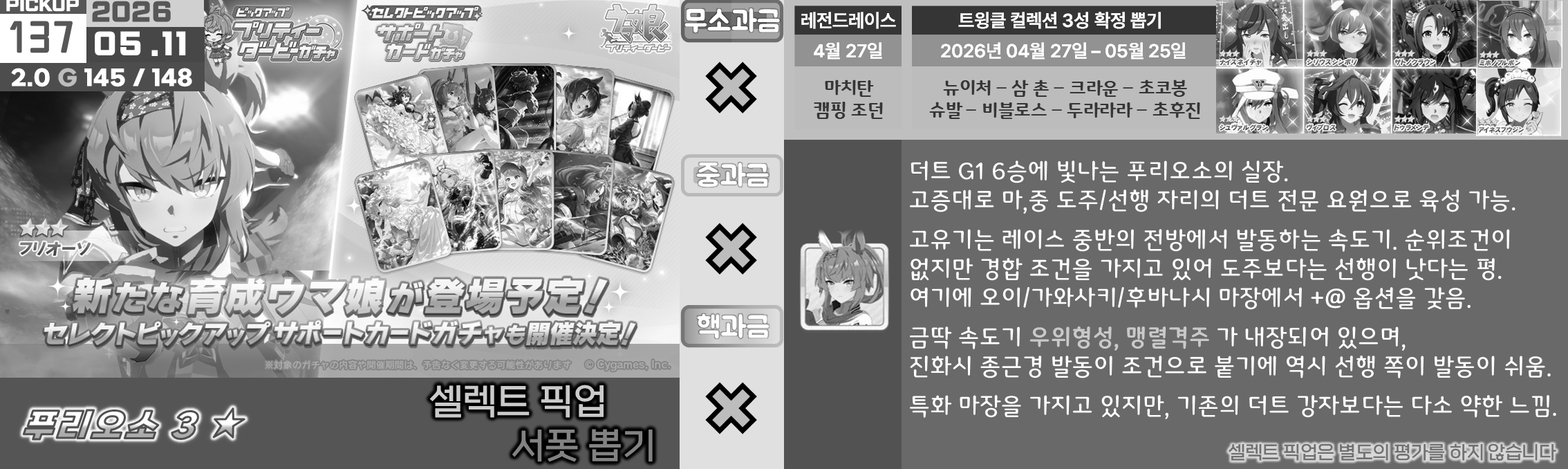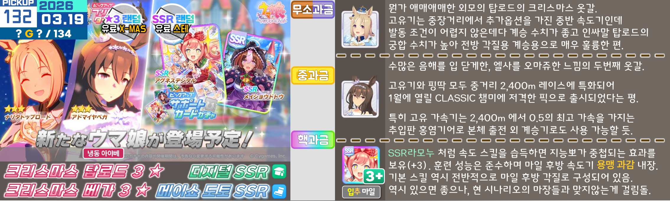 특정 마장 저격 주자들이 옷을 갈아입으면서 출시가 되기 때문에 솔직히 클구리와 같은 위상을 갖추기는 어려운 것이 사실, 마일도 대체제들이 많고 아리마 기념은 특화 주자들도 즐비하다. 사이게도 변별력을 주는 방식을 서포트보다는 주자쪽으로 주는 것 같기도 하다. 매출도 땡기기 좋을테고.