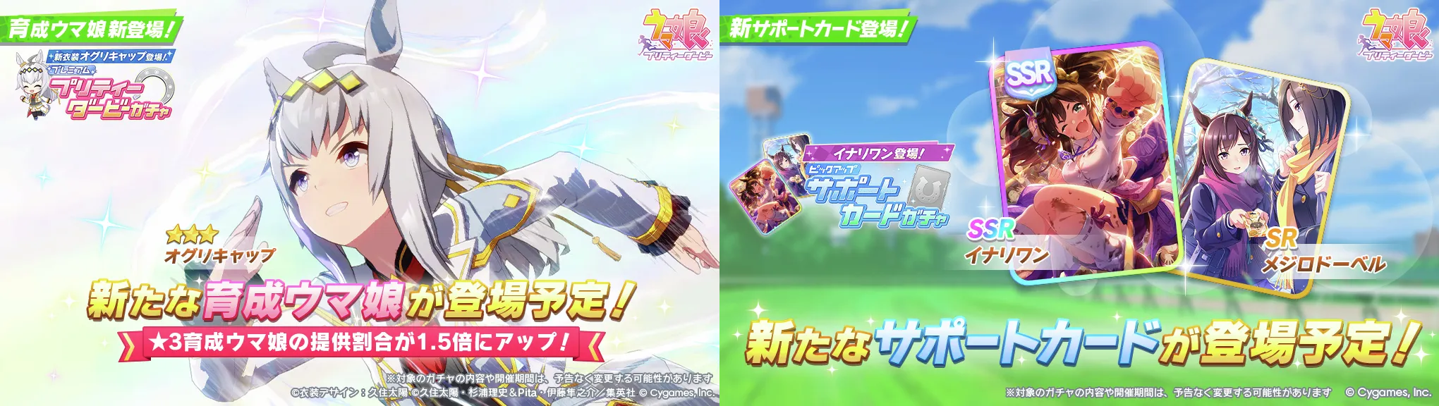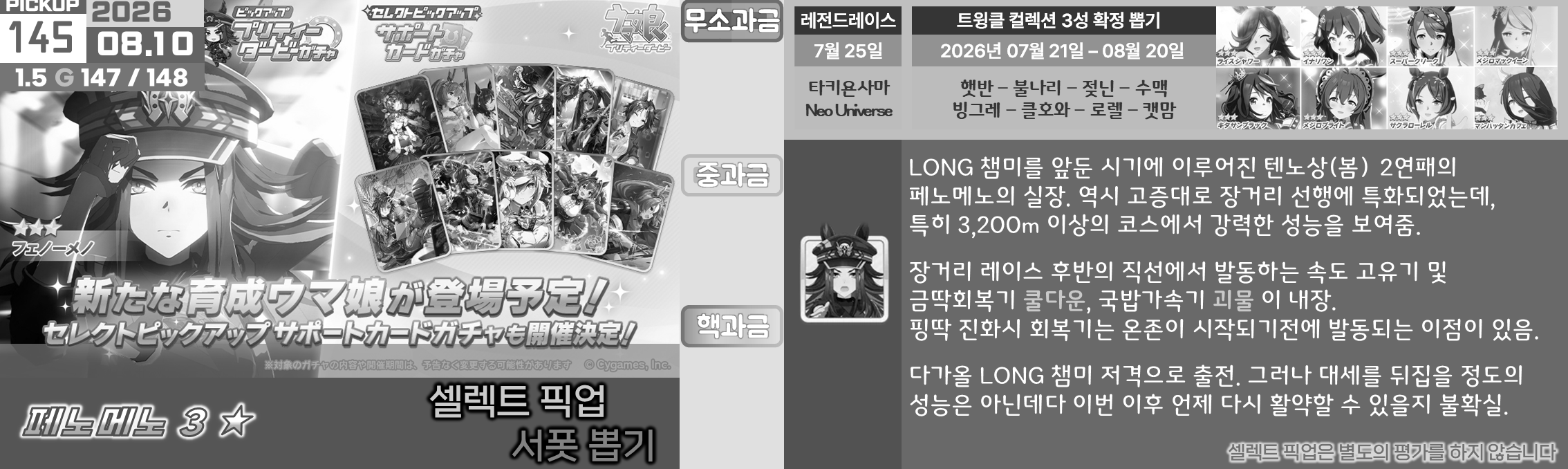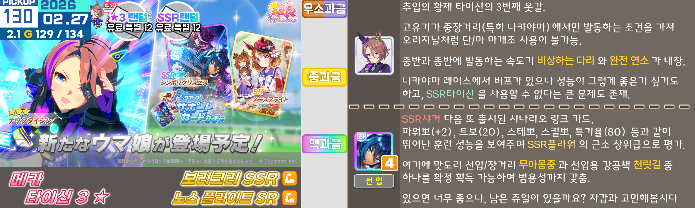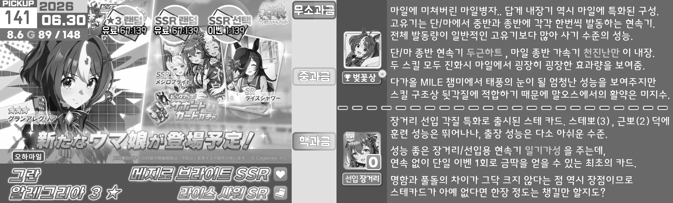 특정 마장 저격 주자들이 옷을 갈아입으면서 출시가 되기 때문에 솔직히 클구리와 같은 위상을 갖추기는 어려운 것이 사실, 마일도 대체제들이 많고 아리마 기념은 특화 주자들도 즐비하다. 사이게도 변별력을 주는 방식을 서포트보다는 주자쪽으로 주는 것 같기도 하다. 매출도 땡기기 좋을테고.