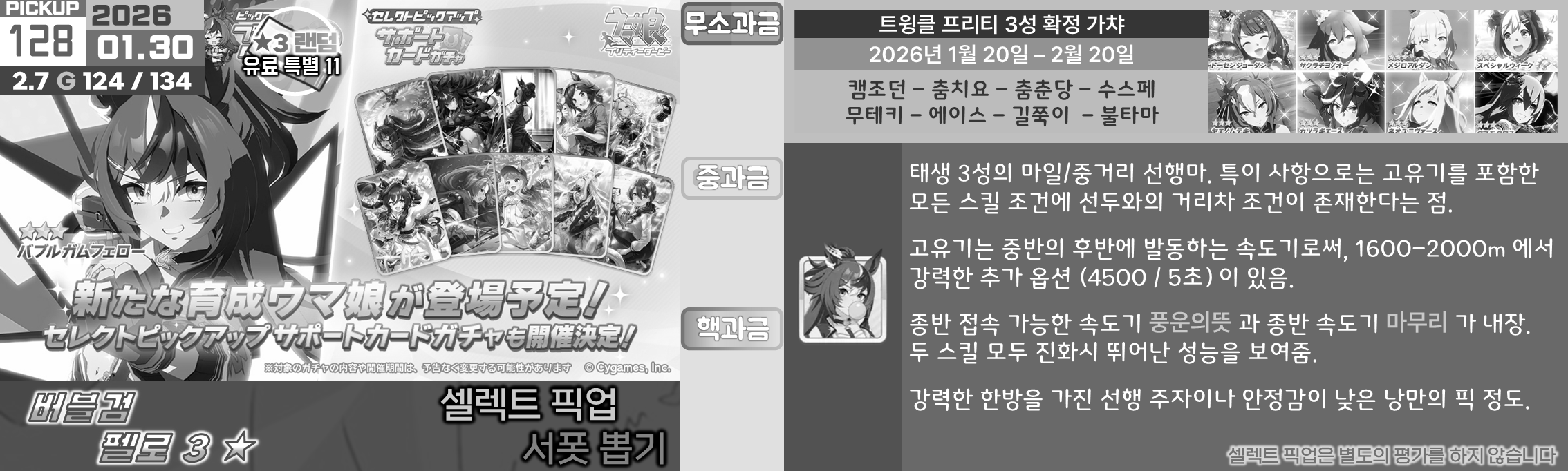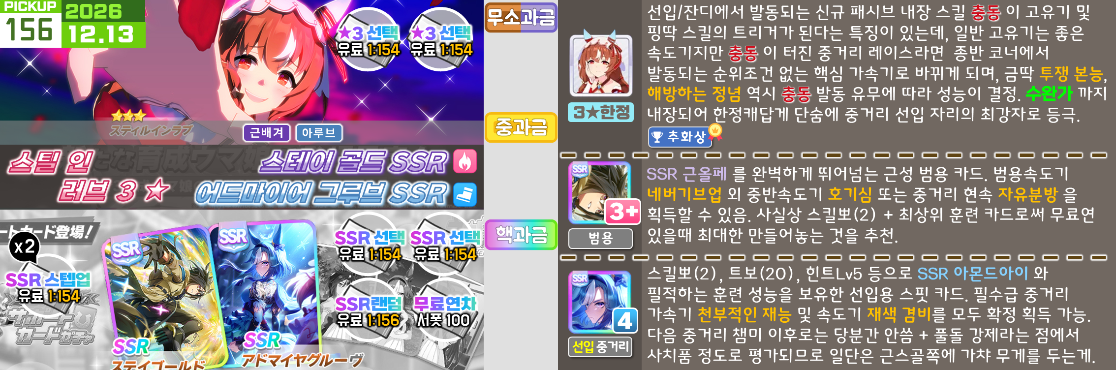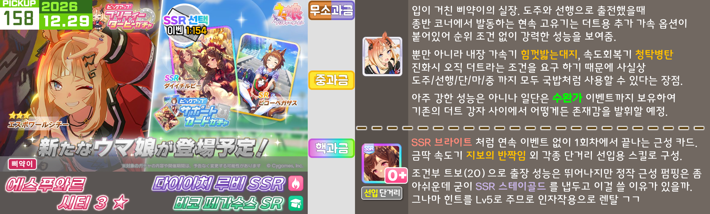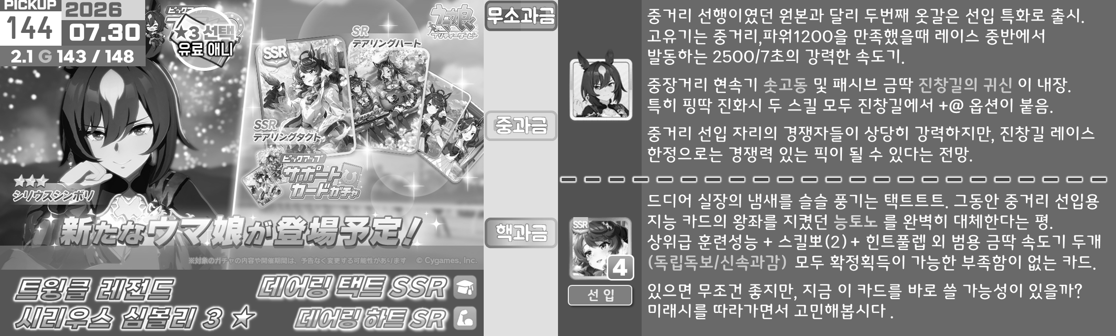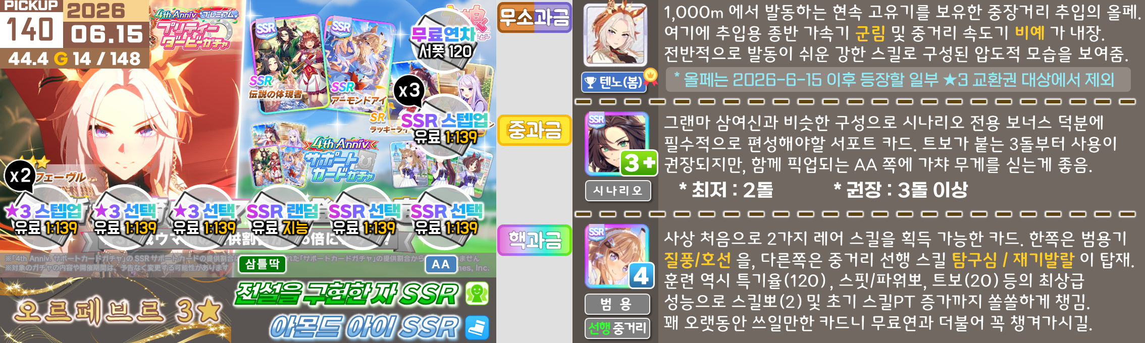 온천향 시나리오의 평가가 좋지 않아서 대풍식제처럼 쉬었음 청년을 예상하고 있었지만 쓰이오와 쓰루브 둘 다 성능이 좋아서 들어가는게 맞는 것 같은 느낌. 우선은 아몬드 아이의 출장과 함께 어떤 편성이 중심이 될지를 살펴보고 결정해야 할 듯. 젠틸-크제는 대도주 견인차가 애매하고 럽온유-스틸인은 특별히 육성에 영향을 받는 부분은 없지만 선행 중심의 쓰이오와 이후 등장하게 될 선행 지능 서포트의 밸류가 두렵다.