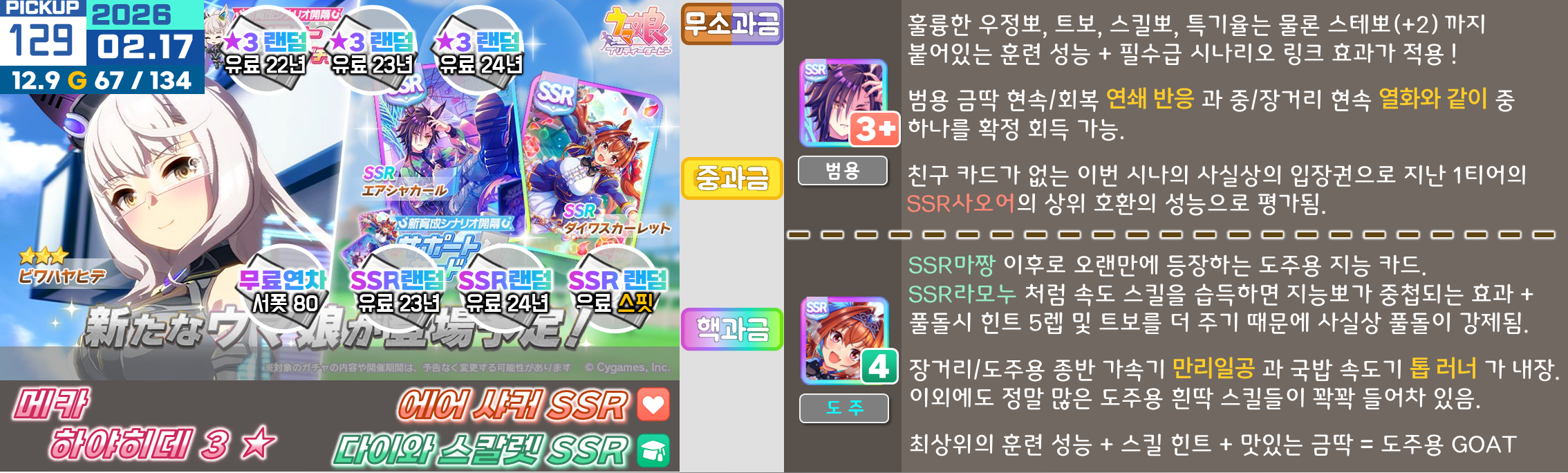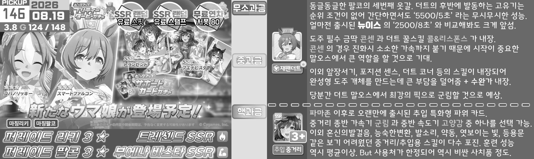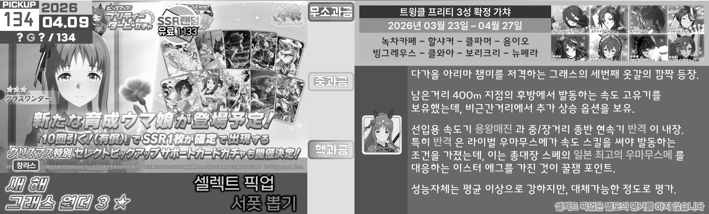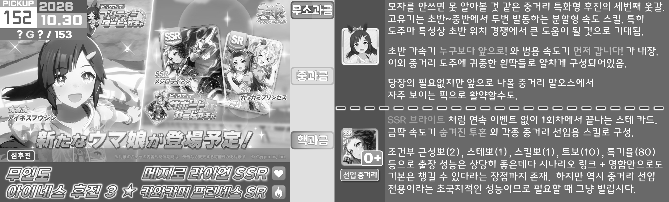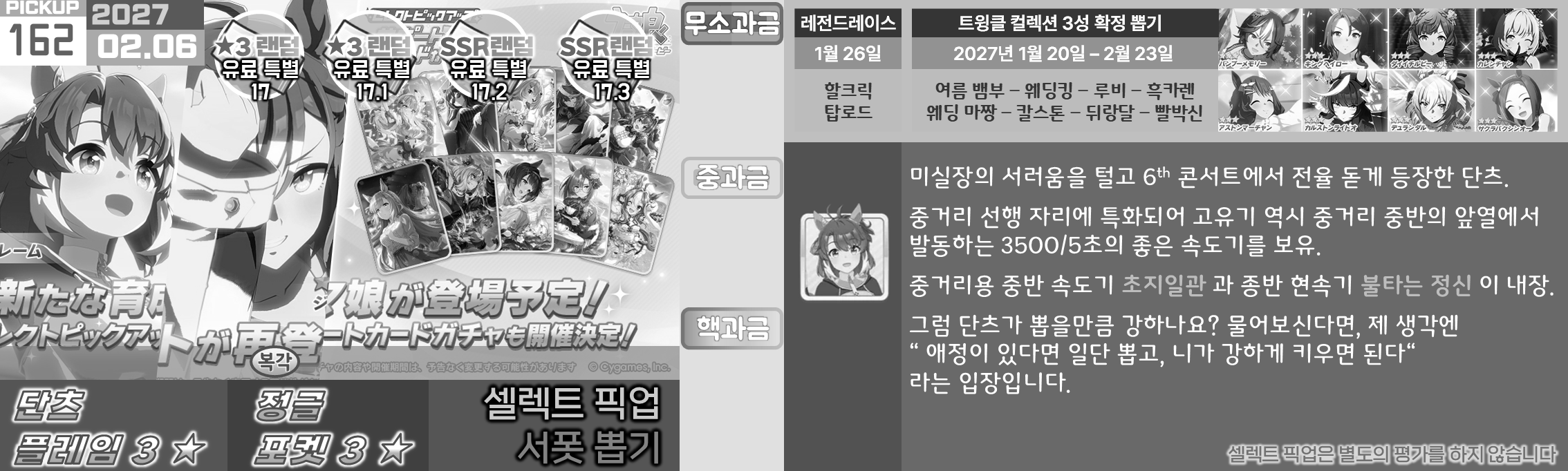온천향 시나리오의 평가가 좋지 않아서 대풍식제처럼 쉬었음 청년을 예상하고 있었지만 쓰이오와 쓰루브 둘 다 성능이 좋아서 들어가는게 맞는 것 같은 느낌. 우선은 아몬드 아이의 출장과 함께 어떤 편성이 중심이 될지를 살펴보고 결정해야 할 듯. 젠틸-크제는 대도주 견인차가 애매하고 럽온유-스틸인은 특별히 육성에 영향을 받는 부분은 없지만 선행 중심의 쓰이오와 이후 등장하게 될 선행 지능 서포트의 밸류가 두렵다.