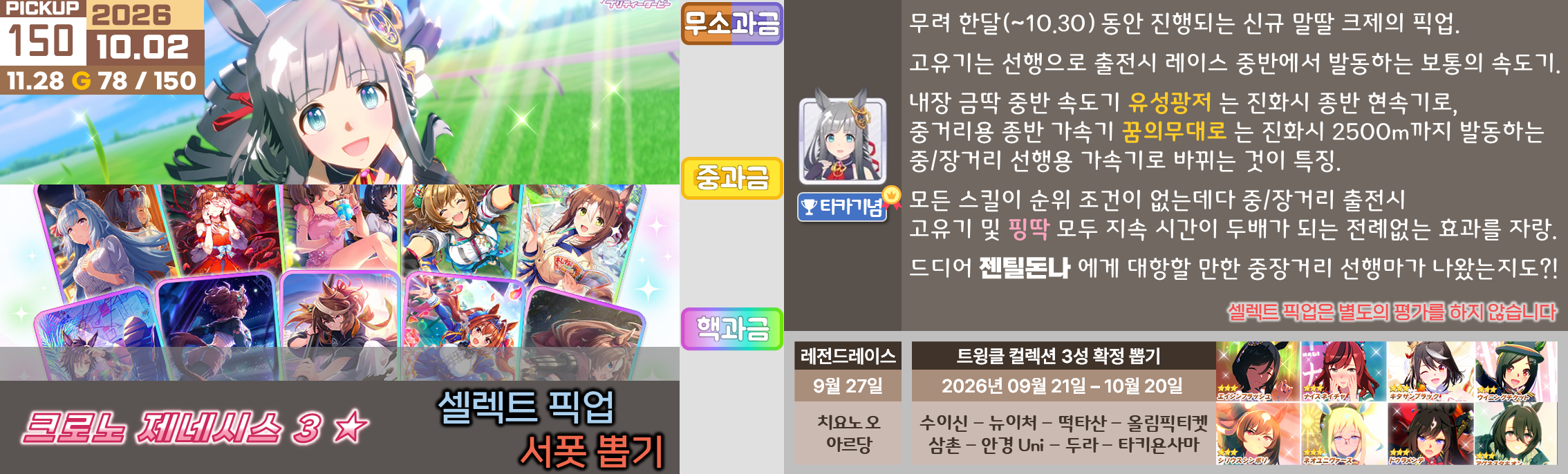 파시노와 이사장의 픽업이 끝났으니 신규 유저들은 다음 시나리오인 메카 우마무스메에 찾아오는 것이 좋겠다.