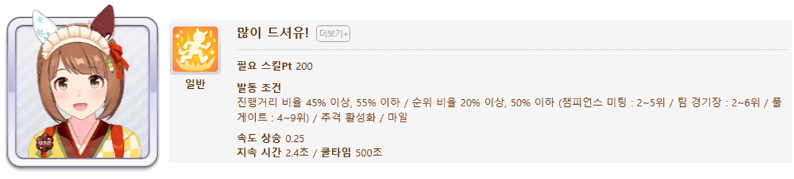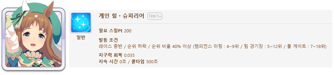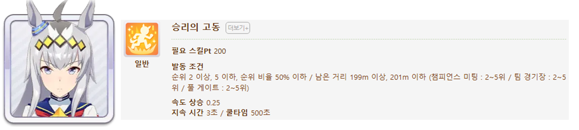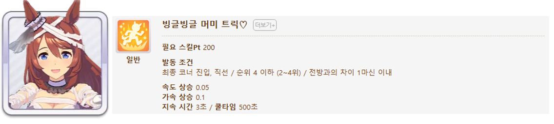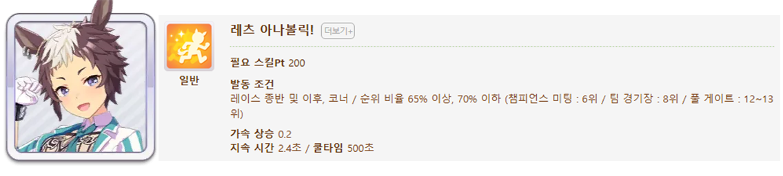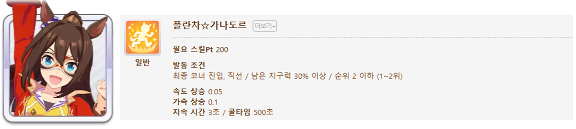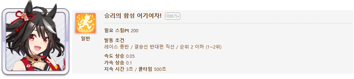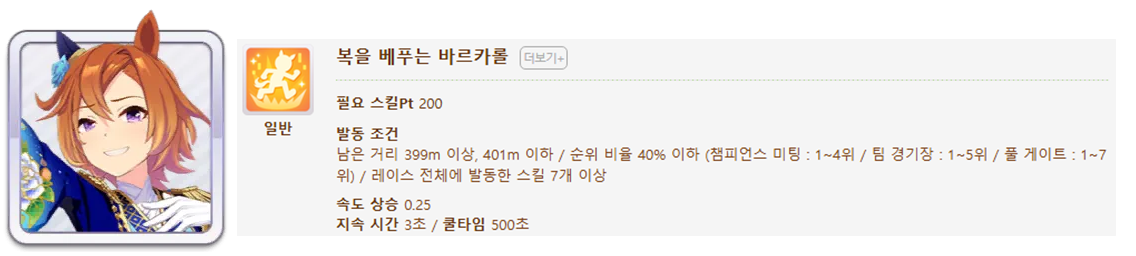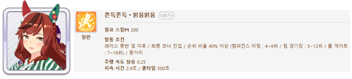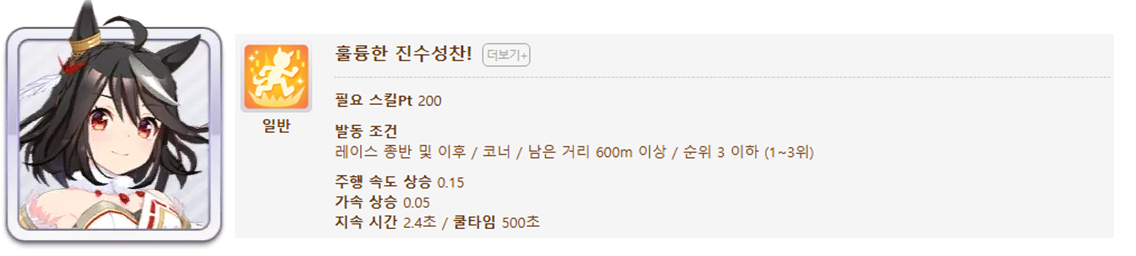 발동 조건 : 1~4위 / 종반 400m일때 발동 / 레이스 전체 발동 스킬 7개(0.25), 6개(0.15)