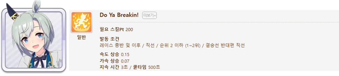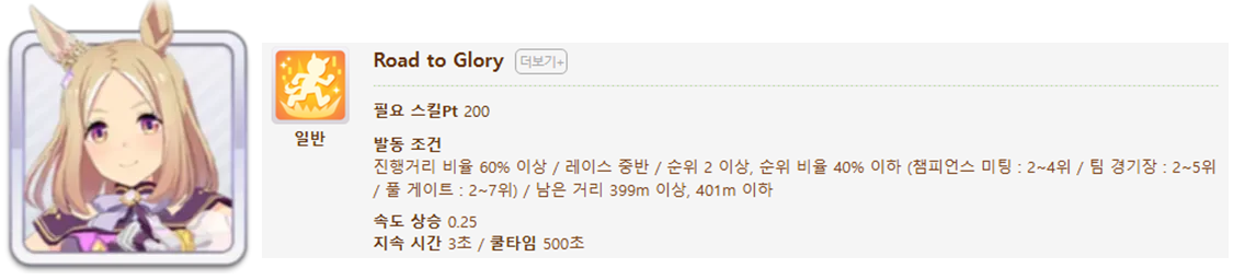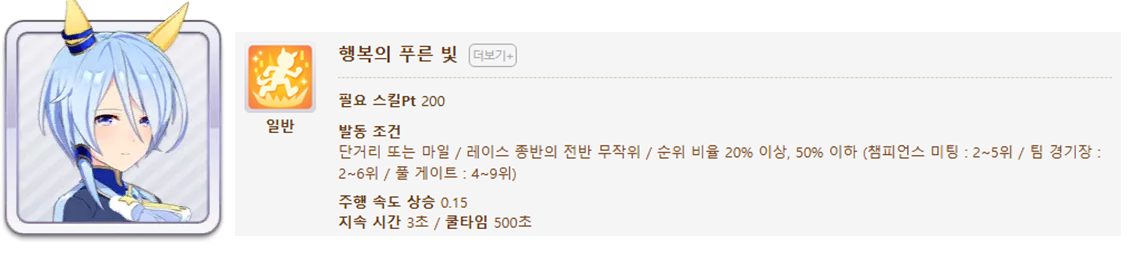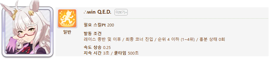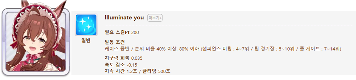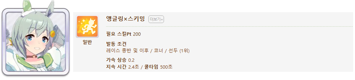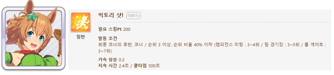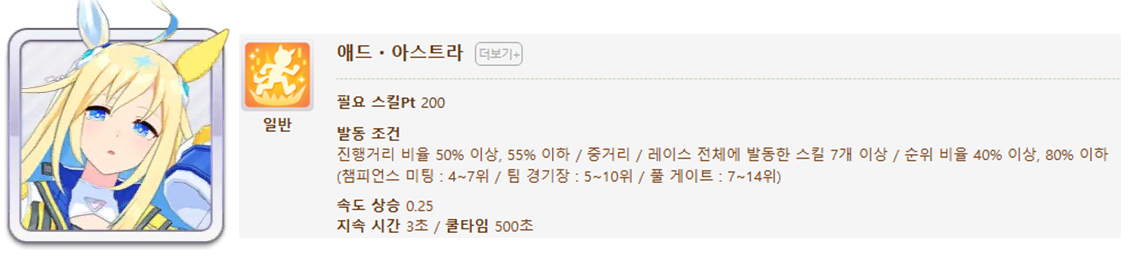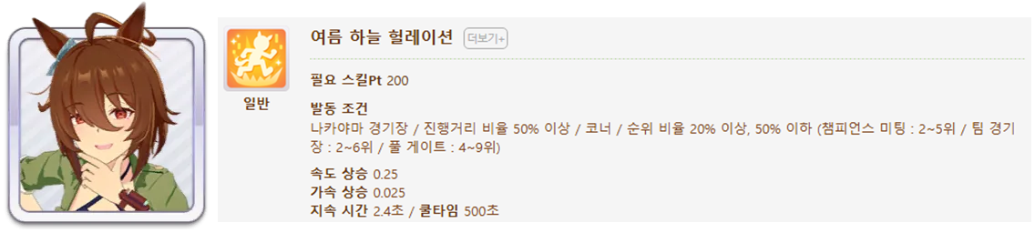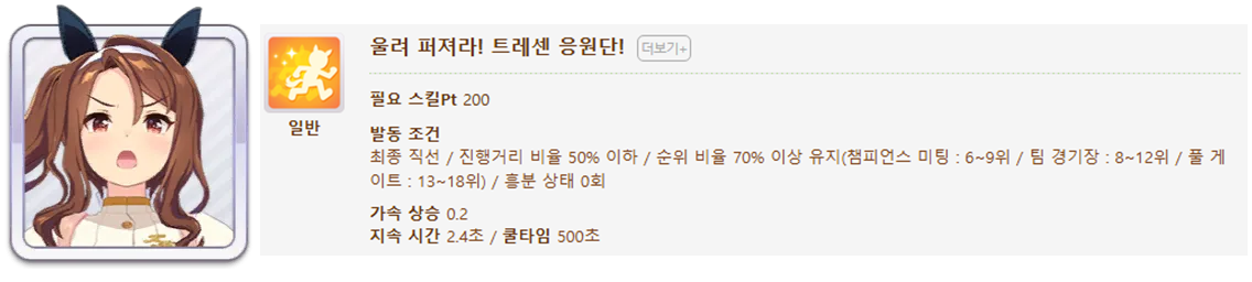 발동 조건 : 1~4위 / 종반 400m일때 발동 / 레이스 전체 발동 스킬 7개(0.25), 6개(0.15)
