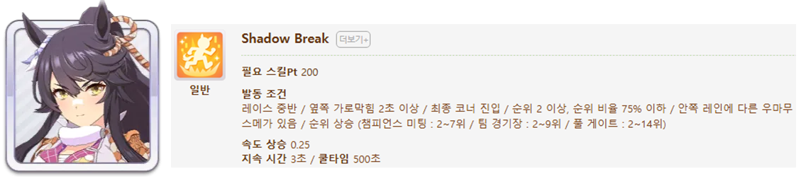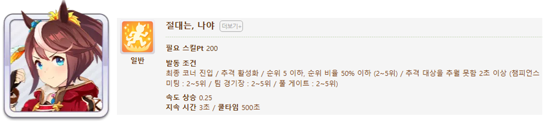 발동 조건 : 2~9위 / 종반 200m / 선두와의 거리차이 5m 이하(0.25), 10m 이하(0.15)