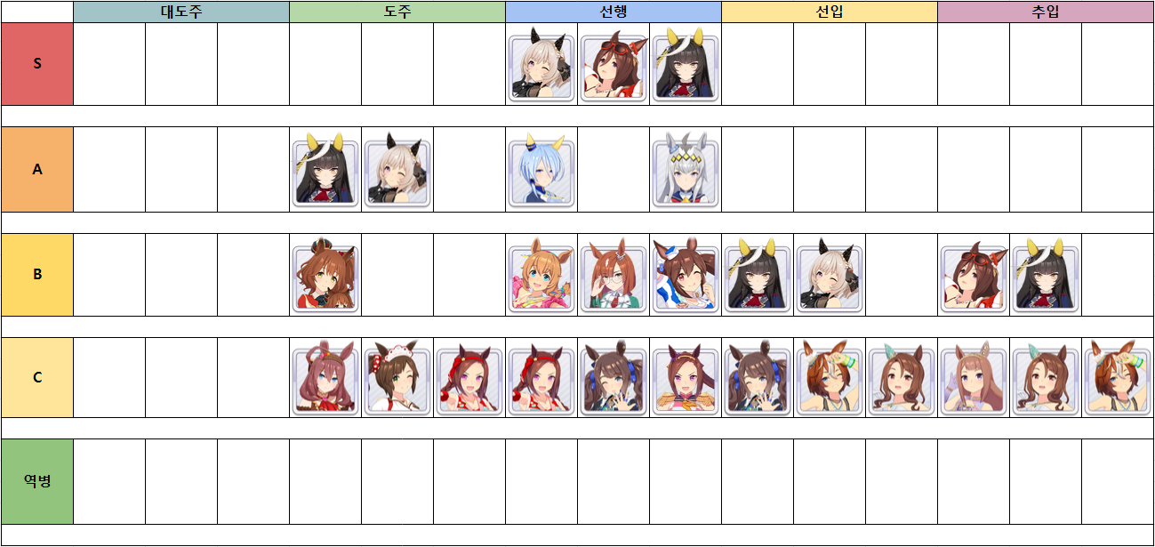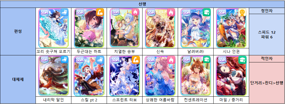 - 마개조보다는 기존의 단거리 선행이나 단거리 인자를 챙기는 정도면 어느 정도 출주 가능