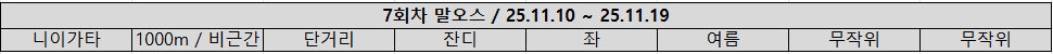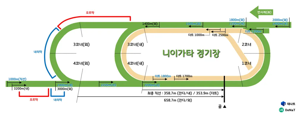 - 니이가타 / 잔디 1000m (단거리) / 근간거리 / 반 시계(좌) 방향 / 계절 : 여름 / 날씨 : 무작위 / 경기장 상태 : 무작위