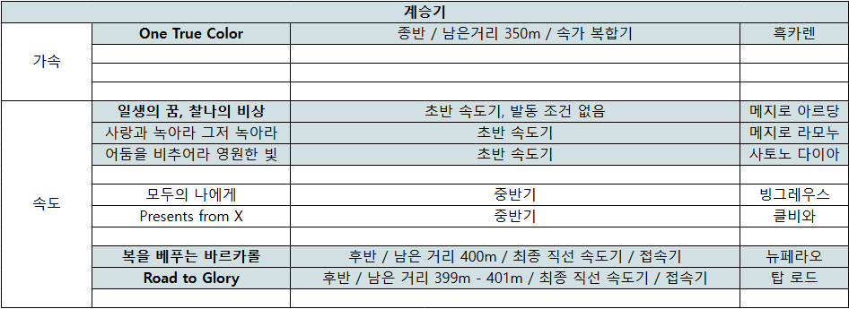 - 초반 속도기를 놓치더라도 종근경 구간에 발동하는 계승기나 내리막에 신경을 쓰는 것도 괜찮다고 생각한다.