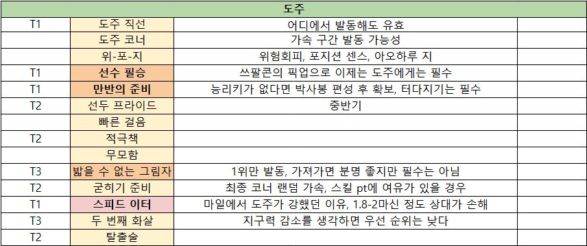도주와 선행은 후반을 늦게 진입할 경우 독점력은 세리머니용으로 사용될 수 있기 때문에 최소 더트 D는 만들어줘야 한다.
