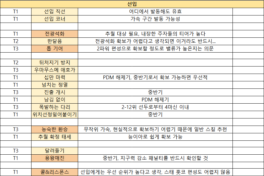 - 선입은 중반기를 좀 더 생각해 보자. 최직기를 하나 챙기는 것보다 안정적인 순위를 끌어올리기 위한 중반기 확보가 중요할 수 있다.