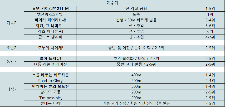 - 콘도르 맹격파 : 선입, 추월 대상이 필요하지만 가장 빠른 종반 가속, 순위 조건이 넓고 선추입이라면 채용