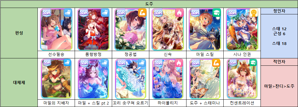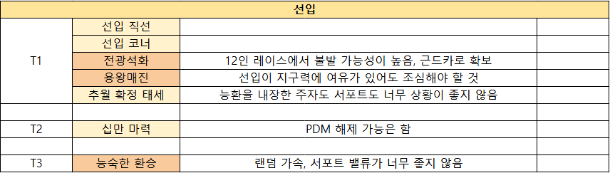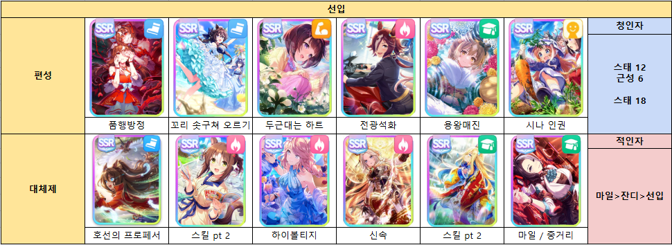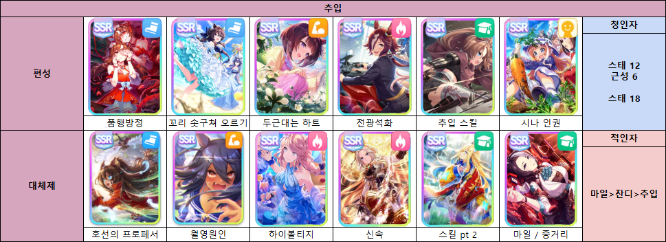 - 추입 : 조금 더 보수적으로 6위 중반기를 챙기는 방향으로 생각한 구성
