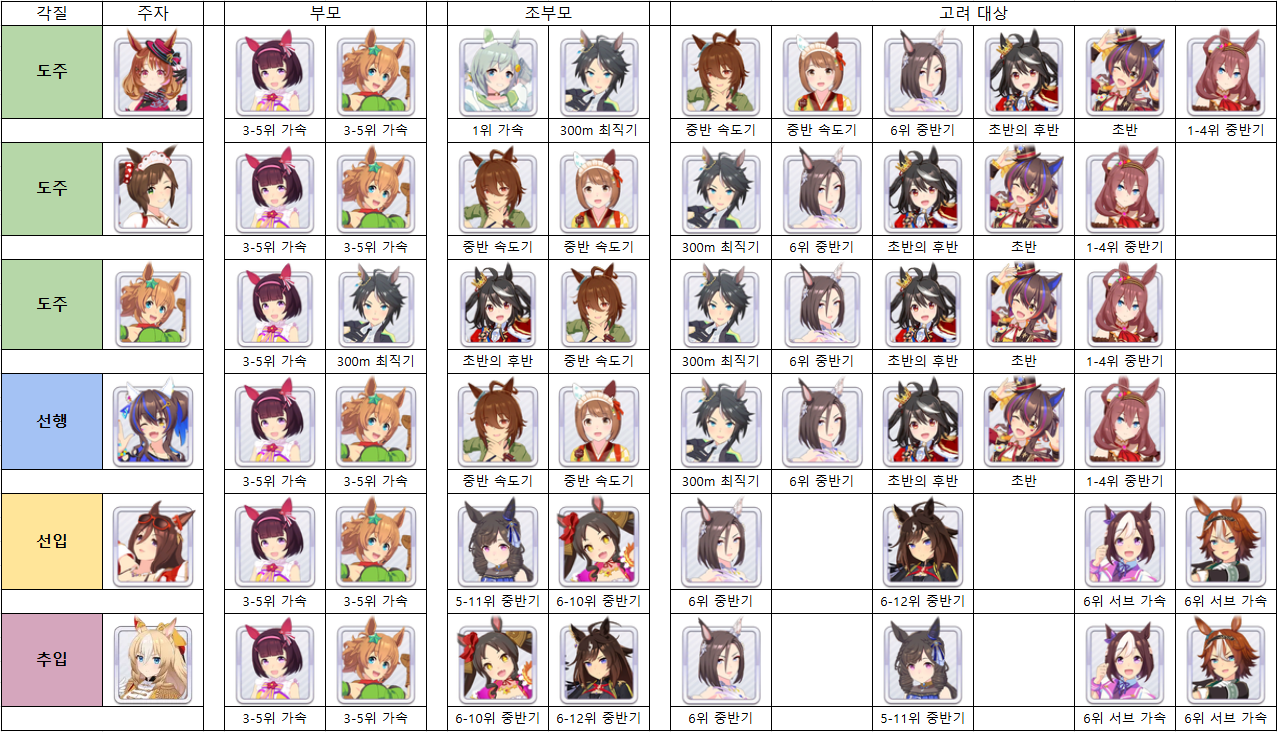 - 근후지 : 쓰제퍼, 능맥퀸을 사용하지 않을 경우 채용하면 좋은 서포트, 선행 육성 시 근올페를 빼고 넣고 싶다.