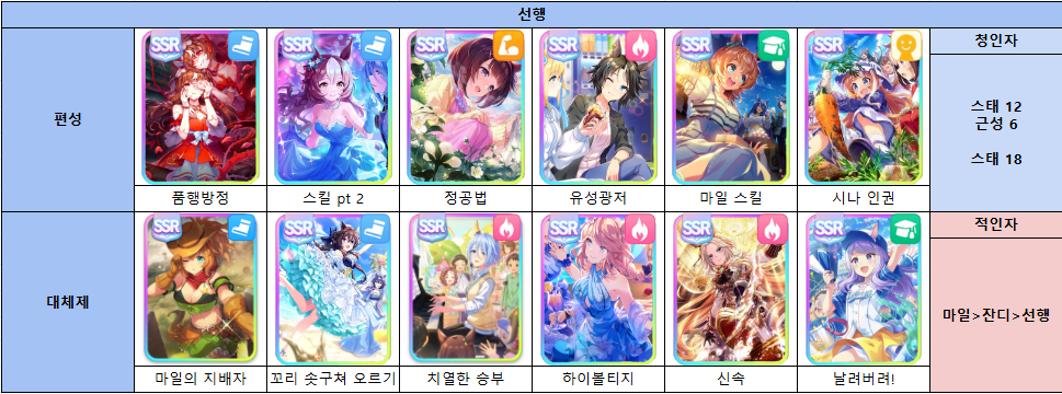 도주는 쓰팔콘, 선입은 능이아, 추입은 능이신으로 기본적으로 필요한 각질 스킬들은 확보할 수 있다. 선행은 인자작으로 확보할 스킬들을 정했다면 능이키와 능맥퀸 중 마일과 선행 스킬 중 하나를 선택해야 할 것 같다. 품행방정은 쓰스틸, 무모함, 오기, 적극책을 포함한 대부분의 마일 스킬은 능이키를 통해 확보가 가능하다. 한줄기 질풍을 포기하고 중반기에 투자하면서 에이스를 선택한 후 위험 회피를 안전하게 받아올 수 있다. 스태미나 확보가 어렵다면 2파 편성으로 파이운도 고려해 보자.